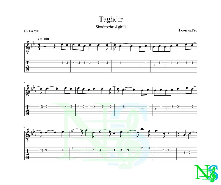 نت گیتار تقدیر شادمهر عقیلی همراه با تبلچر